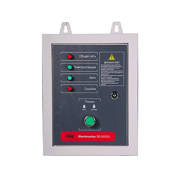 Встроенный в блок автоматики Startmaster BS 6600 D модуль управления контролирует уровень напряжения в энергосистеме и при его падении выполняет запуск подключенного трехфазного бензогенератора. После выхода электростанции на рабочий режим коммутационным устройством производится переключение потребителей на автономный источник питания. В случае восстановления централизованного электроснабжения автоматика осуществляет обратную перекоммутацию нагрузок и глушит двигатель генератора FUBAG, переводя его в дежурный режим.