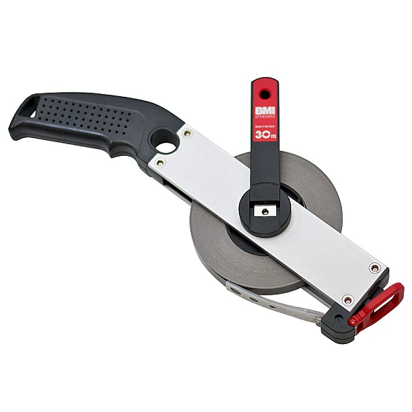 Лента измерительной рулетки BMI STANDARD 30 M производится из высокоуглеродистой стали высокой прочности и снабжена наконечником в форме крюка и петли. Поверх полотна наносится тонкий слой полиамида, исключающий истирание ленты. Сверху по антикоррозионному покрытию наносится измерительная шкала черного цвета с точность 1 мм.