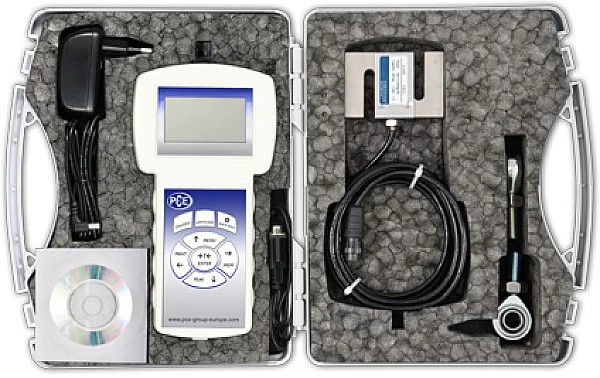 1x динамометр PCE-FB 20 К в комплекте с аккумуляторами, 1х внешний датчик с кабелем подключения и адаптерами, 1x программное обеспечение с кабелем RS-232, 1x сетевой адаптер, 1x приборный кофр