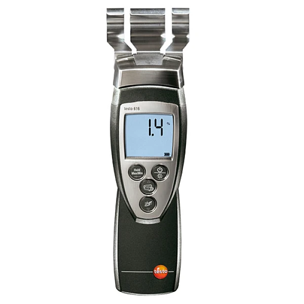 Гигрометр Testo 616 определяет влажность материалов путем измерения взаимодействия электрического поля с объектом контроля, с использованием записанных в памяти прибора характеристических зависимостей. В отличие от метода определения влажности путем измерения проводимости, получаемые результаты при этом не зависят от плотности прижима электродов к проверяемому изделию. Кроме того, такой метод дает возможность фиксировать внутреннюю влажность однородных материалов (на глубине до 5 см), а не на поверхности, чем обеспечивается более высокая точность и достоверность получаемых результатов (особенно для мокрых или смоченных объектов).