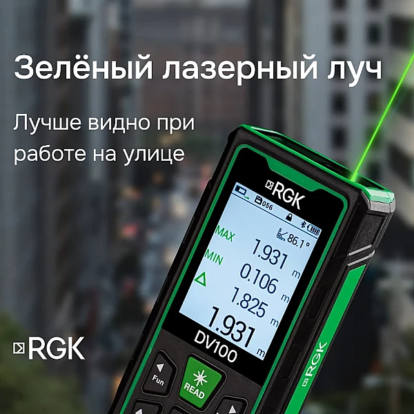 Дальномер RGK DV100 оснащен мощным лазером, который позволяет измерять расстояния на удалении до 100 метров с двухмиллиметровой точностью, что позволяет работать не только в помещениях, но и на улице. Отличительной особенностью дальномера RGK DV100 является наличие яркого лазерного маркера, облегчающего наведение на цель.