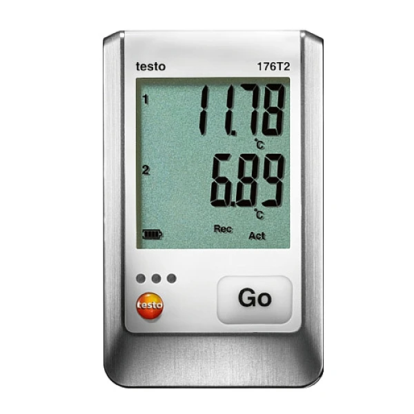 Логгер Testo 176 T2 оснащен двумя измерительными каналами (результаты замеров по каждому из которых отображаются на двухстрочном дисплее) поэтому заменяет собой одновременно два термоизмерителя.