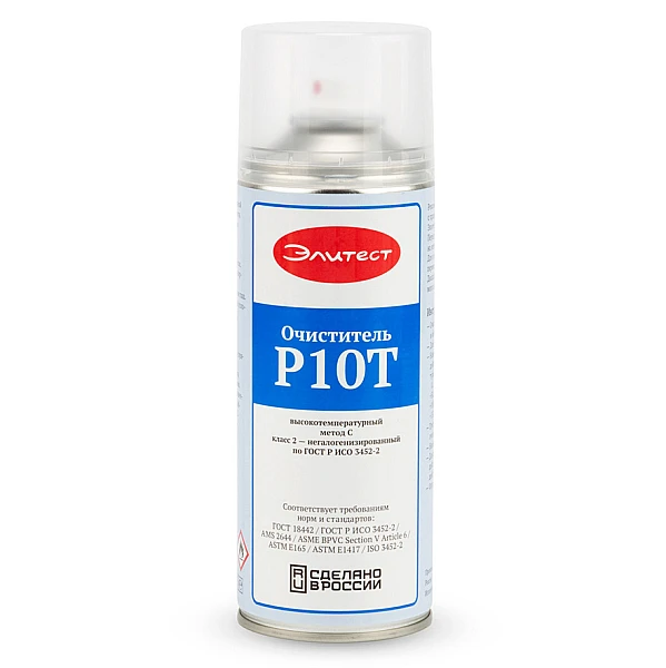 Очиститель Элитест Р10Т адаптирован для использования на объектах контроля, температура которых составляет +5...+200 °С. Эффективно очищает поверхность, не вымывая пенетрант из полости дефекта и не оставляя следов. Изготавливается в России, в Нижнем Новгороде, в соответствии с ТУ 2499-001-49782089-2015.