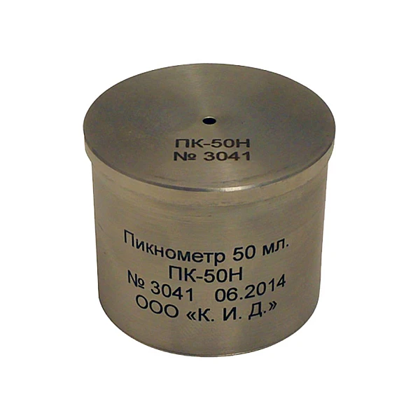 Пикнометр емкостью 50 мл., изготовленный из нержавеющей стали, представляет собой стакан с притертой крышкой, на которой имеется отверстие для выпуска излишков испытуемого материала. Пикнометр изготавливается из твердого сплава с низким коэффициентом температурного расширения.