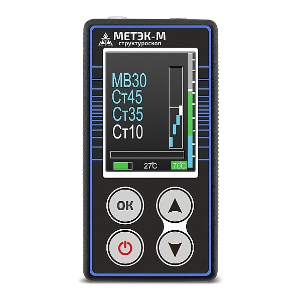 Структуроскоп МЕТЭК-М отображает термоЭДС в микровольтах. Имеет модернизированное ПО: отображение марки металла или сплава вместо цифр термоЭДС. В комплекте поставляются образцы металлов и сплавов (6 штук).