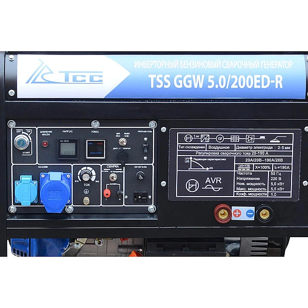 Сварочный генератор TSS GGW 5.0/200ED-R мощностью 5 кВт - это электростанция комбинированного типа, которую можно использовать в качестве автономного источника энергии или в роли сварочного аппарата. Оборудование позволяет выполнять электродуговую сварку (ММА) электродами диаметром 1,6 - 4 мм со сварочным током от 20 до 190
